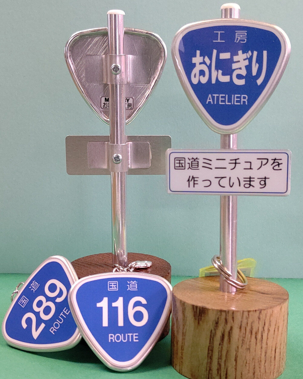 実物同様の硬質アルミ合金製1/12スケール国道標識(通称おにぎり)と、 樹脂粘土や木材などを使ったミニチュアフードやフラワーを制作しています。