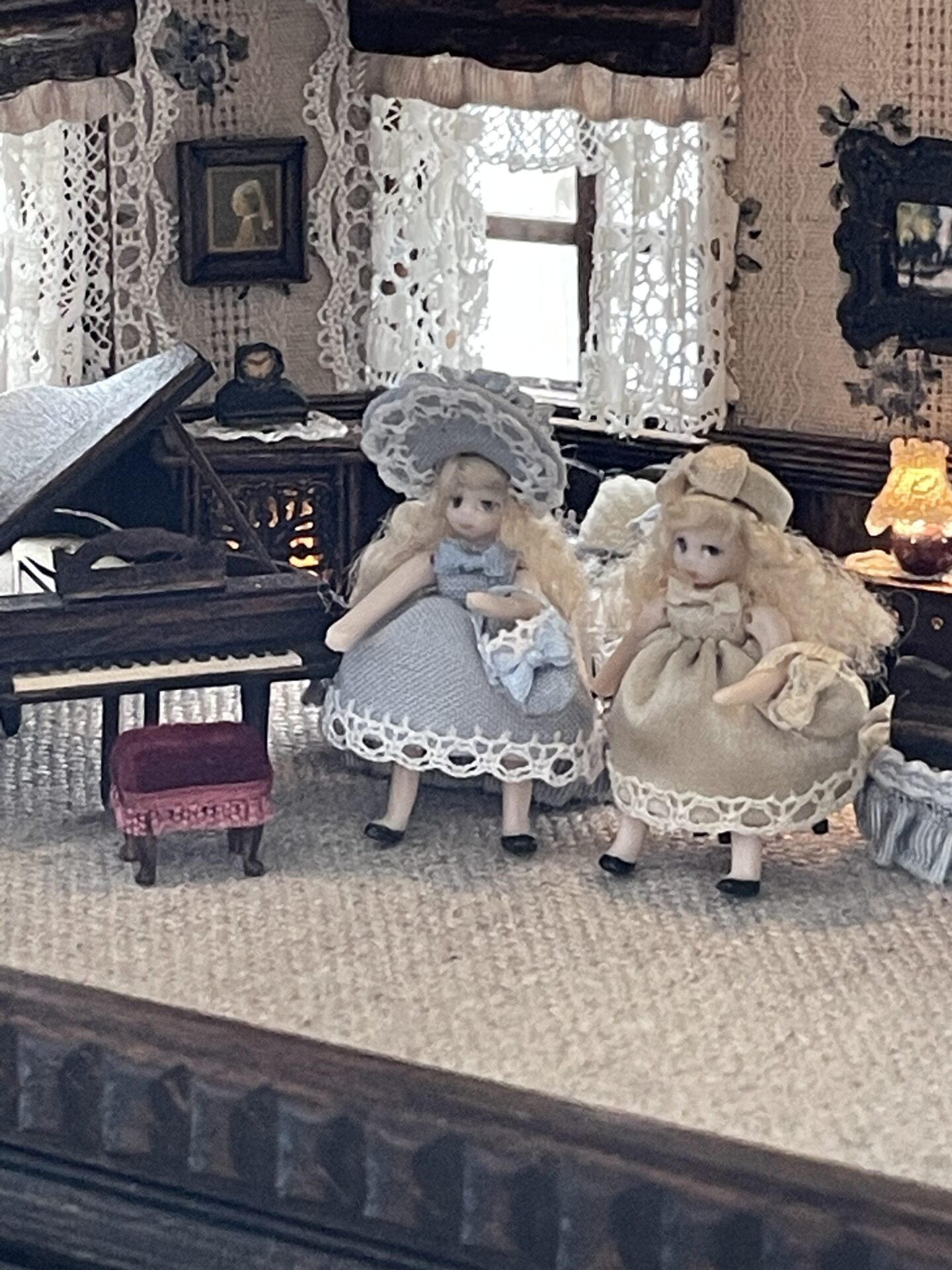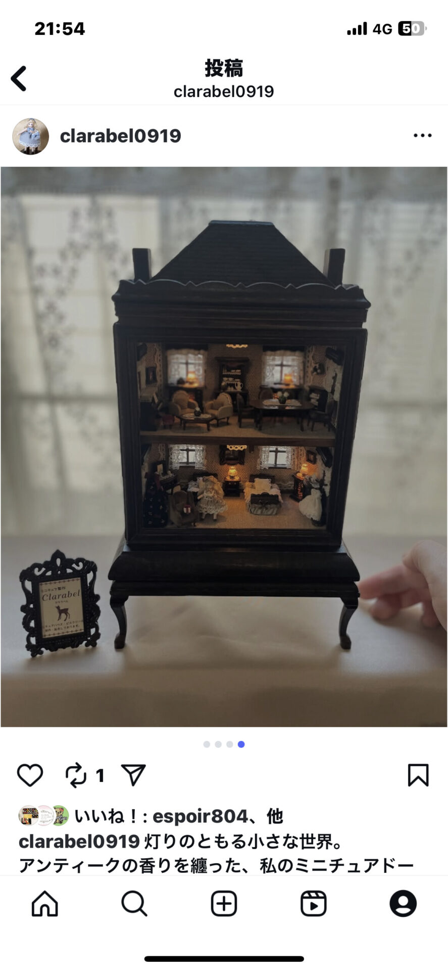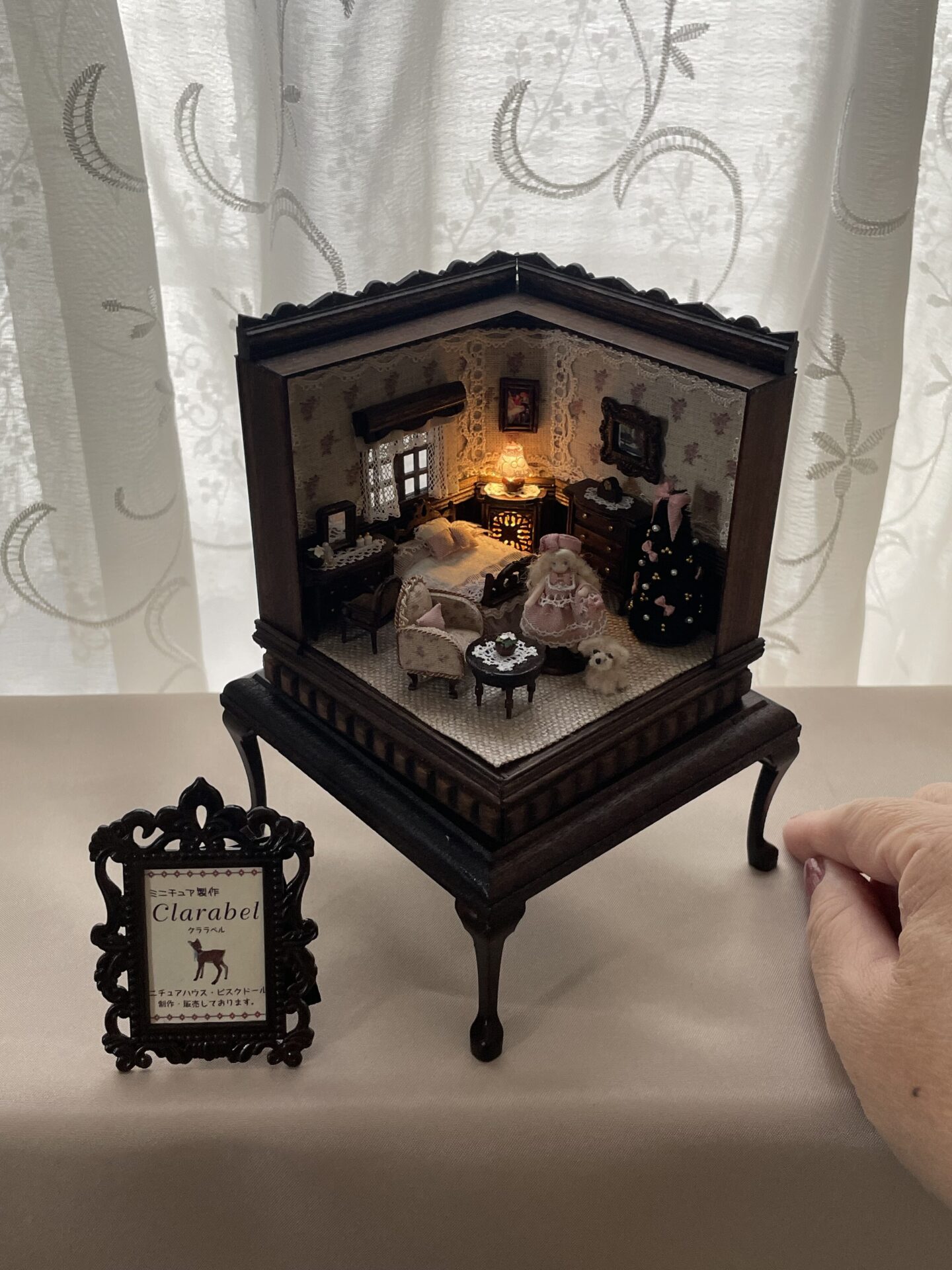 灯りのともる小さな世界。 アンティークの香りを纏った、私のミニチュアドールハウスです。 1/48〜1/90スケールで手づくりし、引き出しや扉が開く家具とビスクドールで小さな物語のある世界を表現しています。