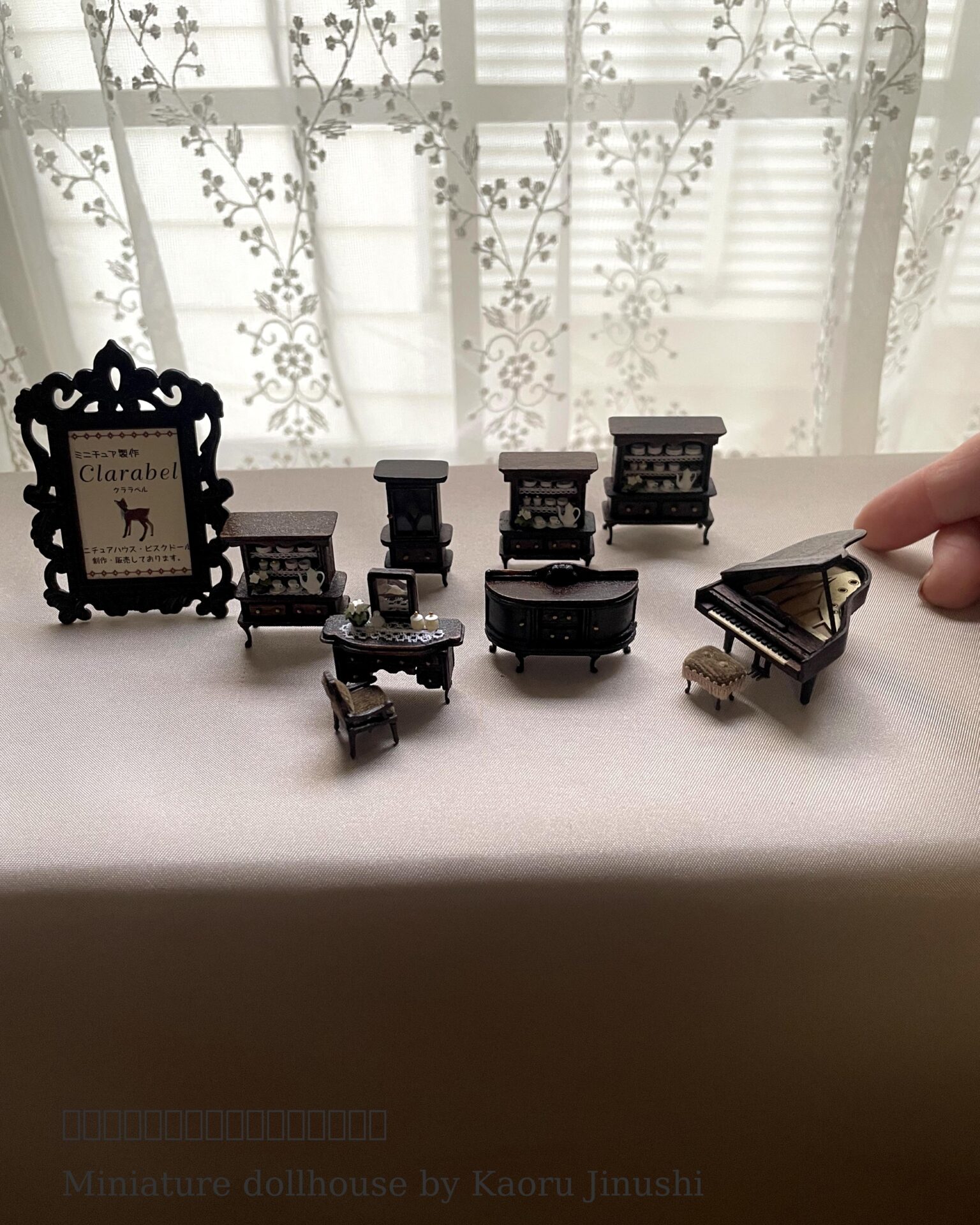 1/48〜1/90スケールの灯りのともる小さなドールハウスを制作販売しています。 家具は単なる飾りではなく、引き出しが実際に開閉したり、扉がしっかりと可動したりと、見えない部分の構造までこだわって作っています。 作品に登場するビスクドールも自ら制作しており、ひとつひとつ焼成し、磨き、組み立てています。小さな身体でも手足が可動し、服装や髪型も部屋の世界観に合わせて仕立てています。 “見た人の心がふっと温かくなるような世界”を目指し、心を込めてひとつひとつ制作しています。
